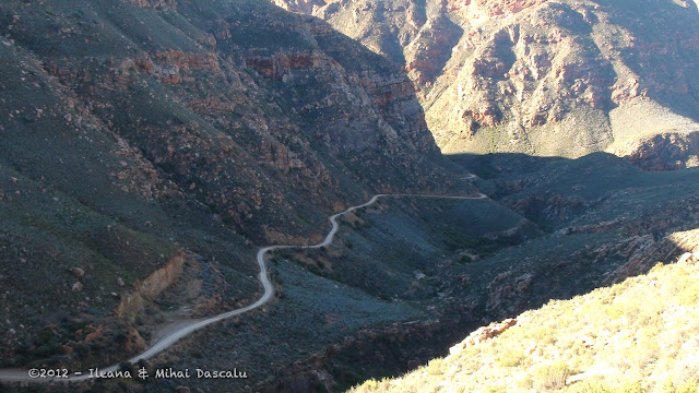 We then drove west and south toward Oudtshoorn. We moved fast and at 2 pm I stopped: "we can get to our next hotel in half an hour or in two and a half hours. Which one?" I don't know what the children said, but their mother chose the longer version and she drove away, north through the Mieringspoort pass crossing the Groot Swartberge mountain range. It was a beautiful and short ride, it didn't prepare us for what was to come. We crossed into another part of Karoo, the bush land that makes most of this country, rode through a couple plantations of olive trees and turned south again to cross the same mountains.